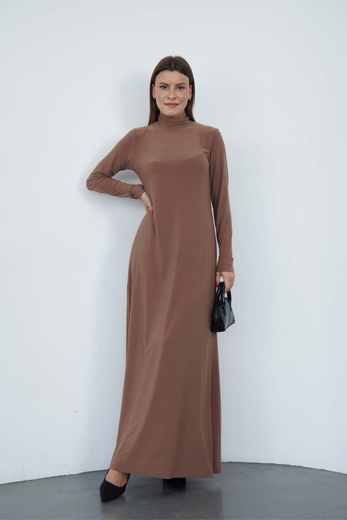 Dora Kadın Maxi Boy Balıkçı Yaka Sandy Elbise-Tarçın