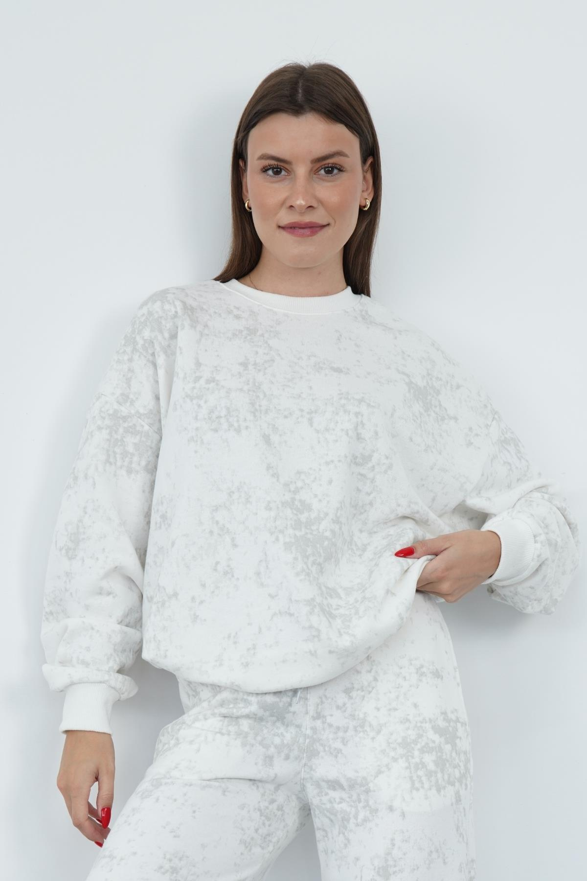Valeria Kadın 3 İplik Şardonsuz Pamuk Oversize Bisiklet Yaka Sweatshirt-Ekru-Gri Baskılı
