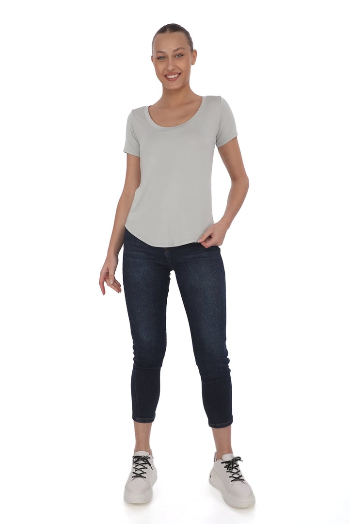 Viskon Dökümlü Dekolte Yaka Tişört-Gri