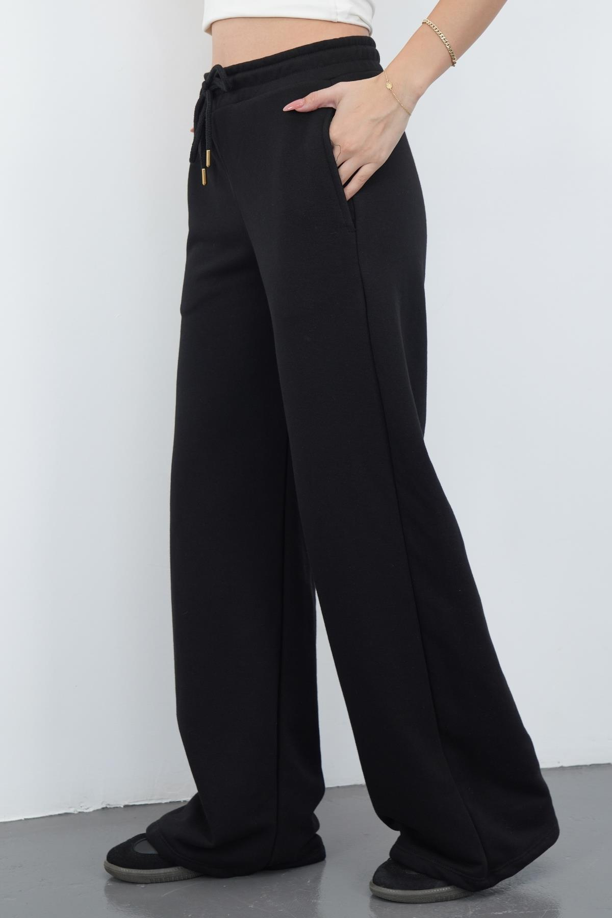 Zenara Kadın 3 İplik Şardonsuz Pamuk Geniş Paça Siyah Eşofman Altı